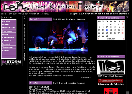 L.E.K. (Livet, evigheten och konsten) är ett projekt som startade förra året i Botkyrka kommuns kulturmånad. L.E.K. eftersträvade att låta så många ungdomar och danspedagoger i kommun träffas och göra en dansföreställning tillsammans. Det var inte föreställningen i sig som var målet, utan vägen dit. L.E.K. var och är också ett integrations- och socialt arbete med fokus på ungdomar i de olika delarna i kommunen. ”Vägen dit” är arbetet/mötena/träningen som ägde rum fyra gånger innan föreställningen. Föreställningen turnerade runt under hösten på fyra platser i Botkyrka. och eleverna möte varandra på varandras hemtrakter och på deras egna villkor med en viss väggledning. Uppslutningen var stort och resultaten mer än förväntat. Totalt engagerades sex dansgrupper, ett femtiotal ungdomar, Riksteatern, Alby Fejmarna, ABF Botkyrka/Salem, Musikhuset Lagret, Studiefrämjandet, Folketshus- Tumba, Cirkus Cirkör m.fl. IM Storm har i sammarbete med LEK gruppen utvecklat en webbsida till projektet och alla är väldigt nöjda med resultatet. Vi hälsar LEK välkommen till IM Storm.